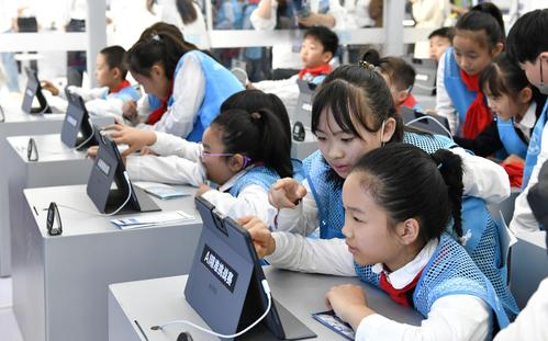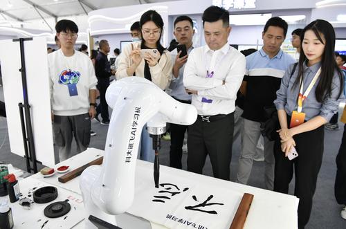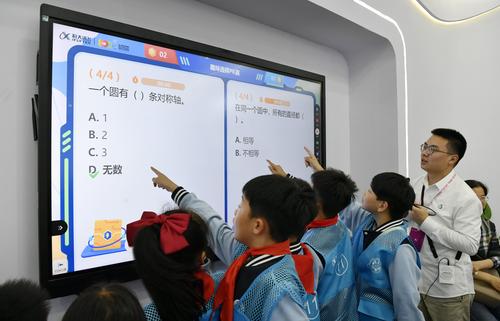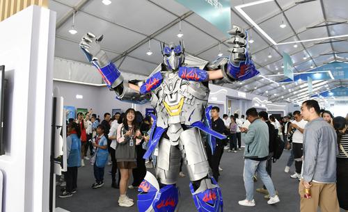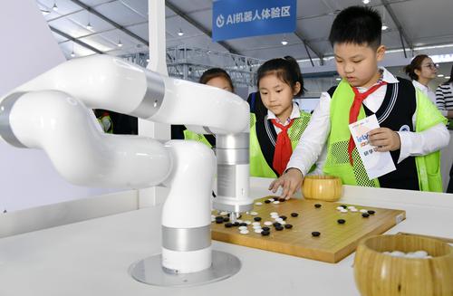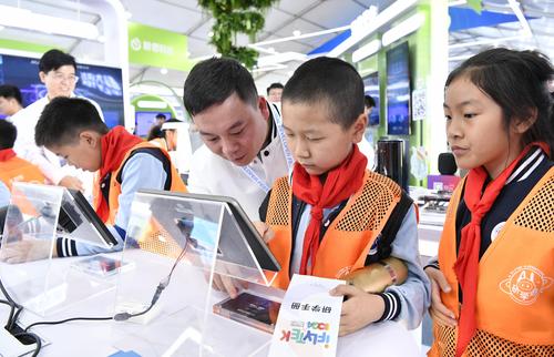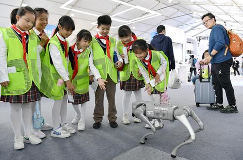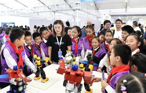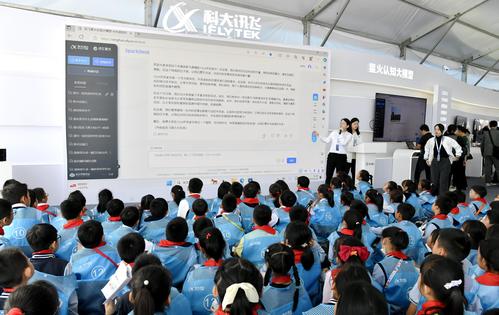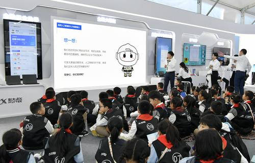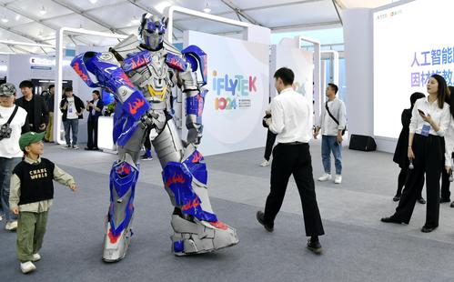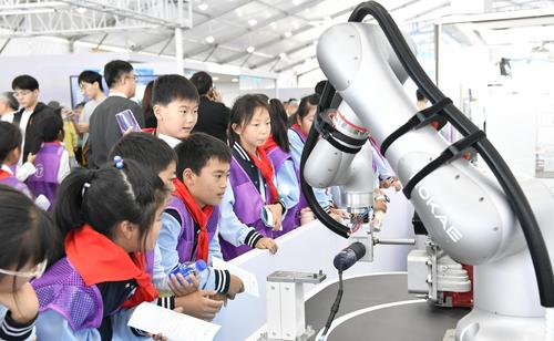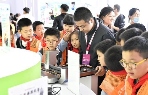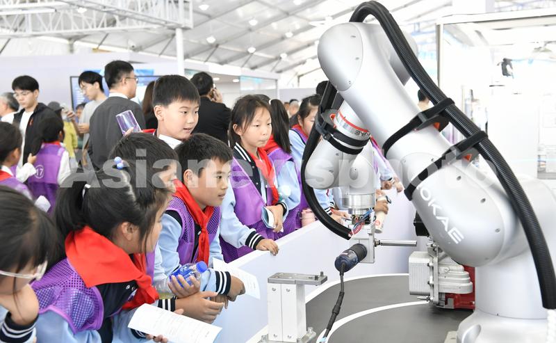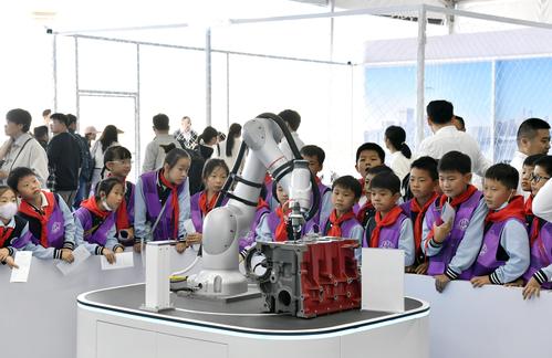 图片说明:2023年10月24日,安徽省合肥市,第六届世界声博会暨2023全球1024开发者节在位于蜀山区的合肥体育中心开幕,小朋友在观看智能机器人加工演示。