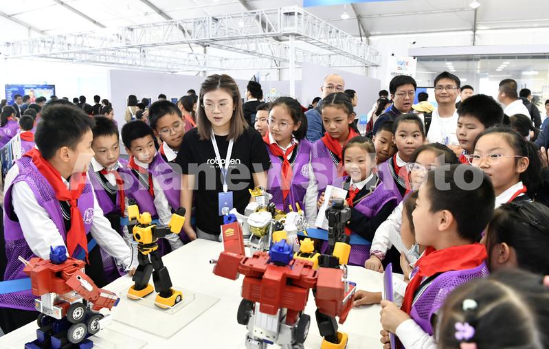 图片说明:2023年10月24日,安徽省合肥市,第六届世界声博会暨2023全球1024开发者节在位于蜀山区的合肥体育中心开幕,小朋友在观看智能机器人表演。