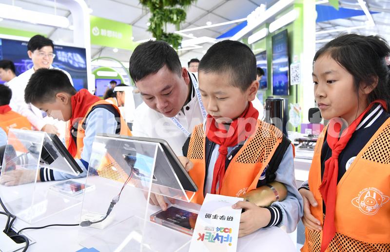 图片说明:2023年10月24日,安徽省合肥市,第六届世界声博会暨2023全球1024开发者节在位于蜀山区的合肥体育中心开幕,小朋友在体验智能教学设备。