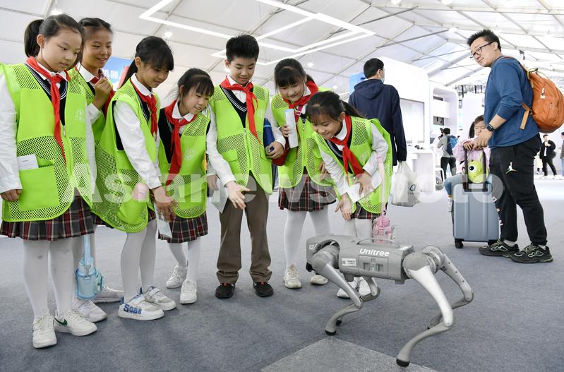 图片说明:2023年10月24日,安徽省合肥市,第六届世界声博会暨2023全球1024开发者节在位于蜀山区的合肥体育中心开幕,小朋友和机器狗互动。