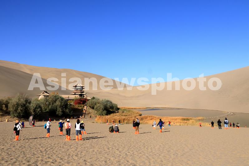 图片说明:2023年10月28日,游客在甘肃省敦煌市鸣沙山月牙泉景区游览。