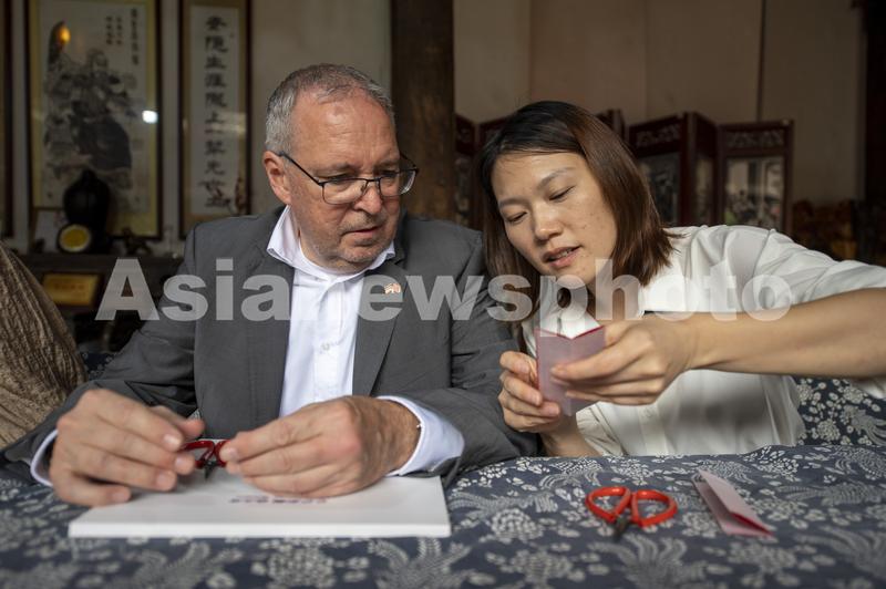 图片说明:2023年10月27日,浙江省金华市剪纸博物馆,德国友人在学习剪纸工艺,体验中国传统艺术的独特魅力。
