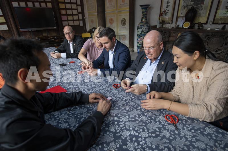 图片说明:2023年10月27日,浙江省金华市剪纸博物馆,德国友人在学习剪纸工艺,体验中国传统艺术的独特魅力。