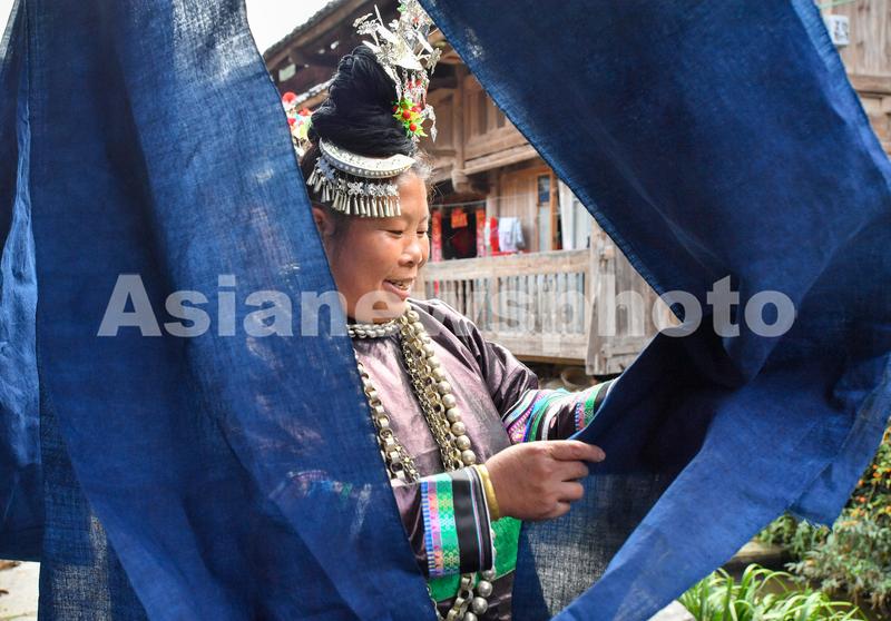 图片说明:2023年10月29日,贵州省黔东南苗族侗族自治州榕江县栽麻镇宰荡侗寨,侗族妇女在晾晒侗布。