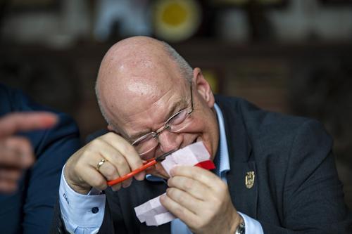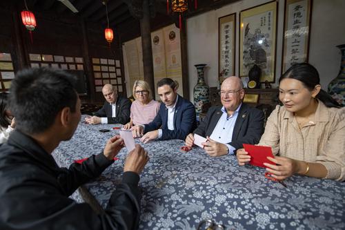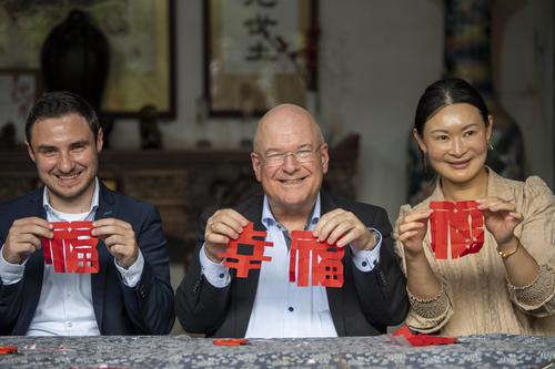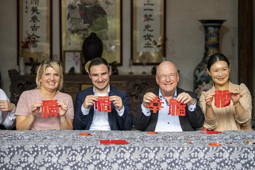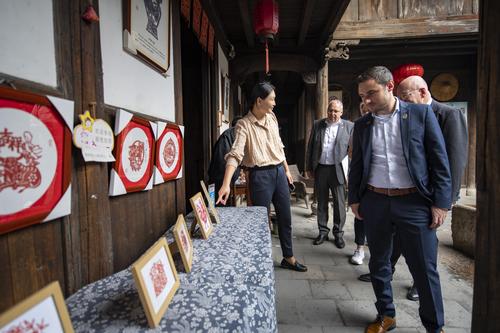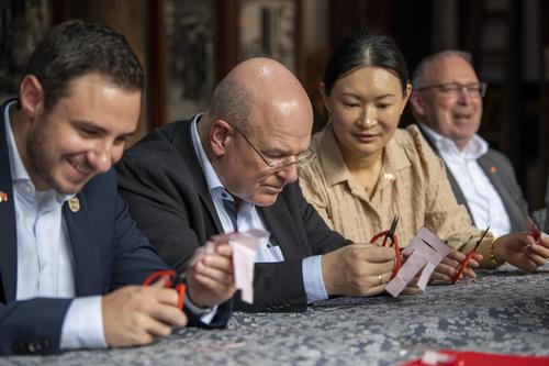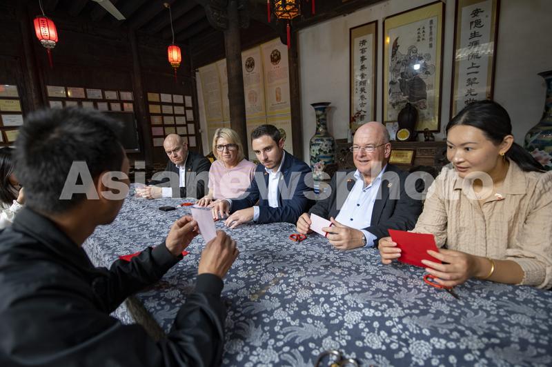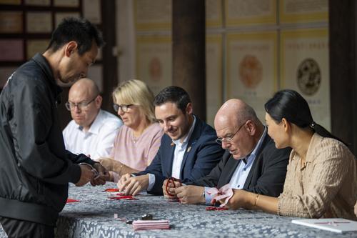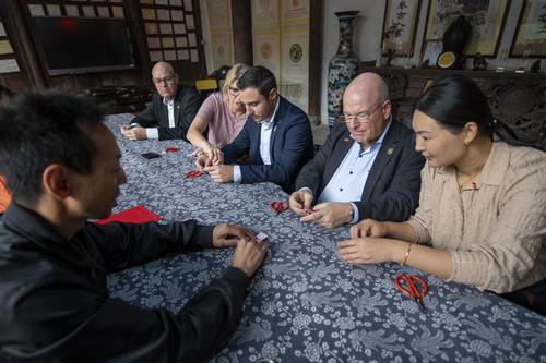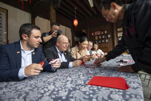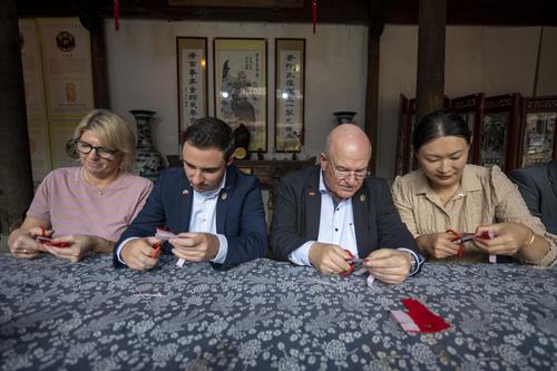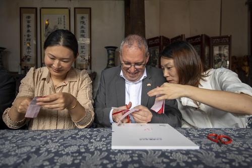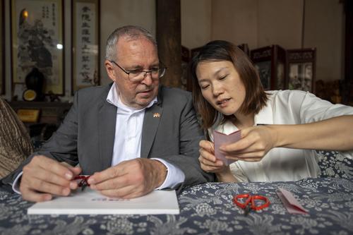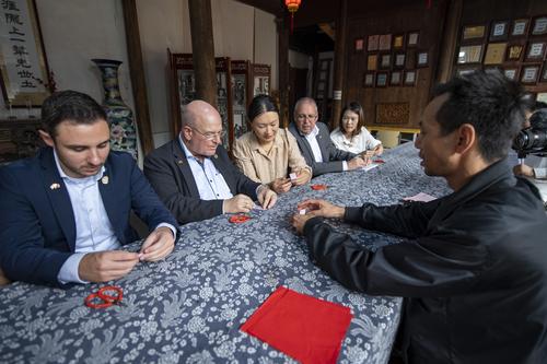 图片说明:2023年10月27日,浙江省金华市剪纸博物馆,德国友人在学习剪纸工艺,体验中国传统艺术的独特魅力。