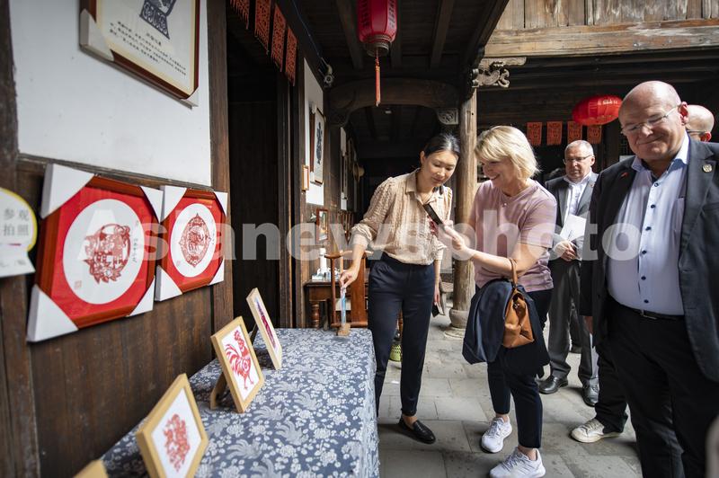图片说明:2023年10月27日,浙江省金华市剪纸博物馆,德国友人在欣赏剪纸艺术品。
