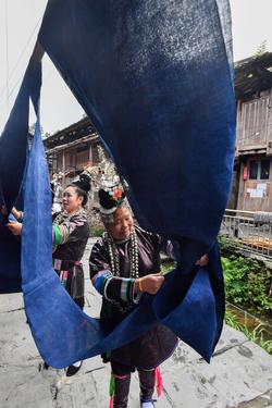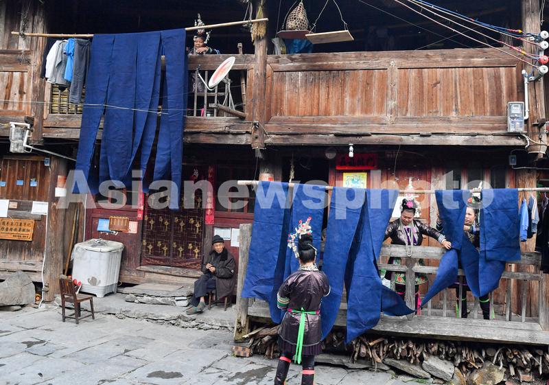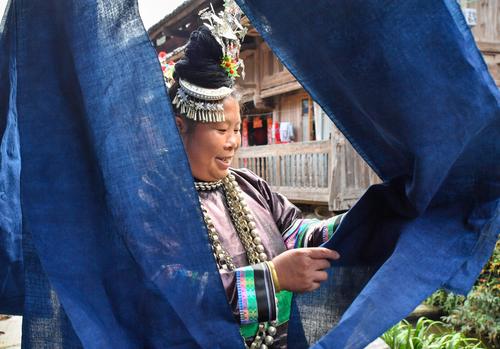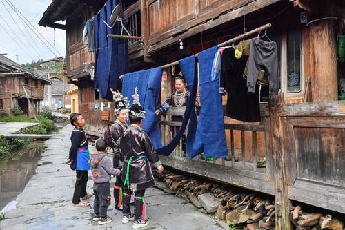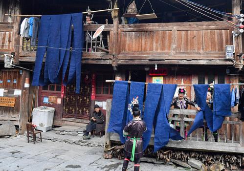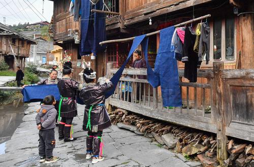 图片说明:2023年10月29日,贵州省黔东南苗族侗族自治州榕江县栽麻镇宰荡侗寨,侗族妇女一边晾晒侗布一边交流织布染布的经验体会。