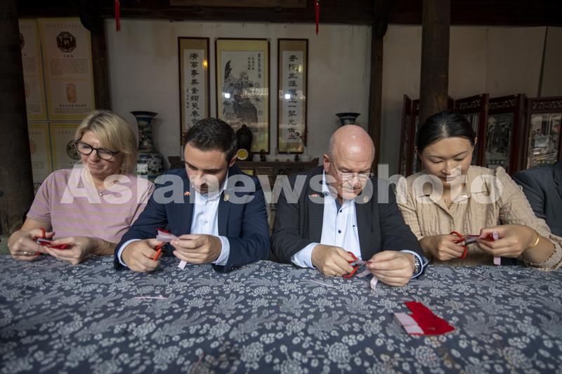 图片说明:2023年10月27日,浙江省金华市剪纸博物馆,德国友人在学习剪纸工艺,体验中国传统艺术的独特魅力。