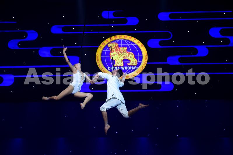 图片说明:2023年10月30日,河北吴桥,在第十九届中国吴桥国际杂技艺术节闭幕仪式上,在第十九届中国吴桥国际杂技艺术节闭幕仪式上,演员在表演节目《双人皮条》。