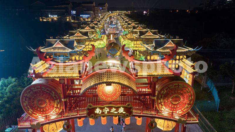 2023年10月30日晚,游人在广西南宁市五象新区“广旅·南宁之夜”游玩(无人机照片)。