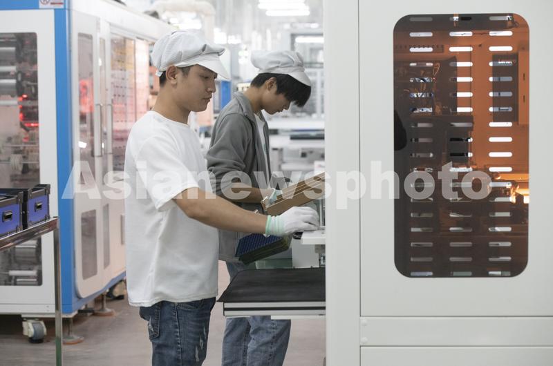 2023年11月8日,在浙江省金华市润马光能科技有限公司生产流水线上,工人们赶制太阳能光伏组件订单。