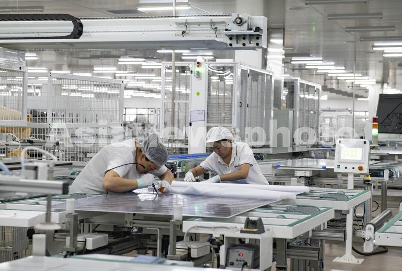 2023年11月8日,在浙江省金华市润马光能科技有限公司生产流水线上,工人们赶制太阳能光伏组件订单。
