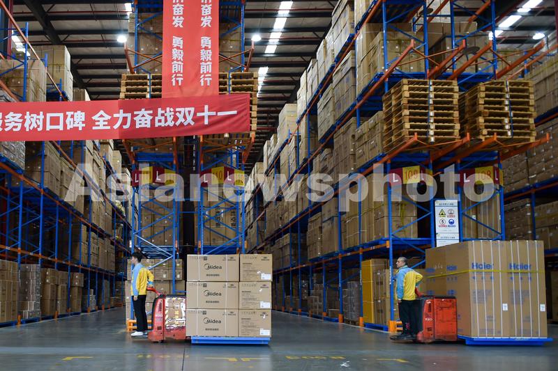 2023年11月10日,江苏省南京市的苏宁华东物流中心,工人搬运商品。