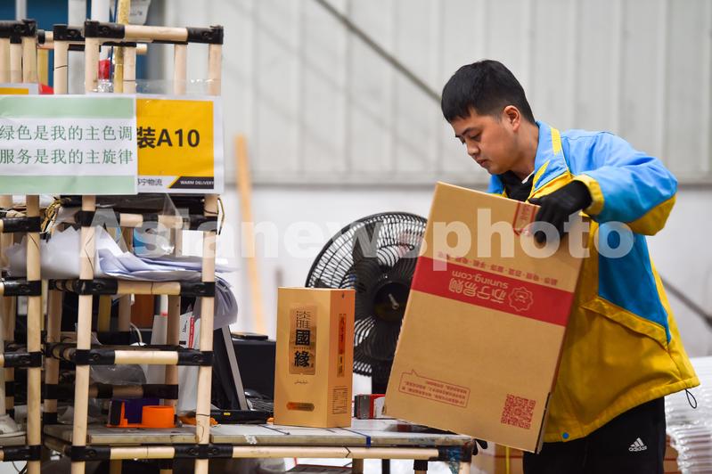 2023年11月10日,江苏省南京市的苏宁华东物流中心,工人在包装商品。