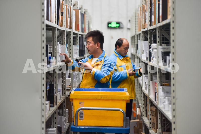 2023年11月10日,江苏省南京市的苏宁华东物流中心,工人在拣选商品。