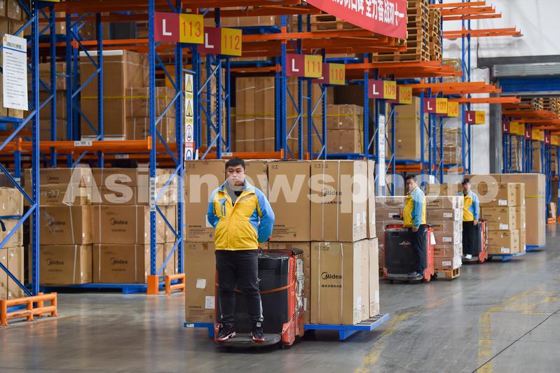 2023年11月10日,江苏省南京市的苏宁华东物流中心,工人搬运商品。
