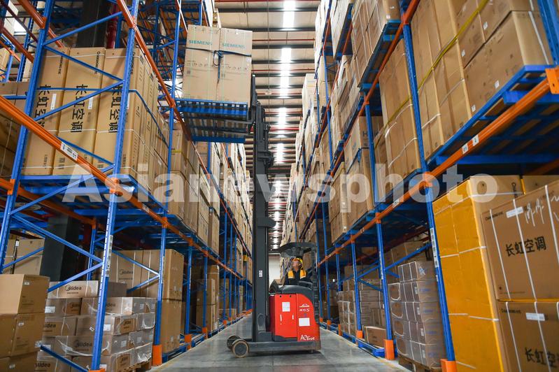 2023年11月10日,江苏省南京市的苏宁华东物流中心,工人搬运商品。