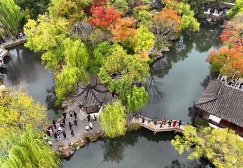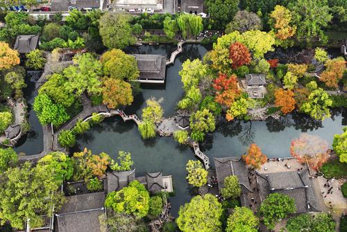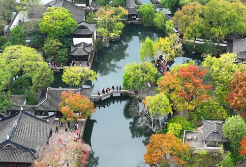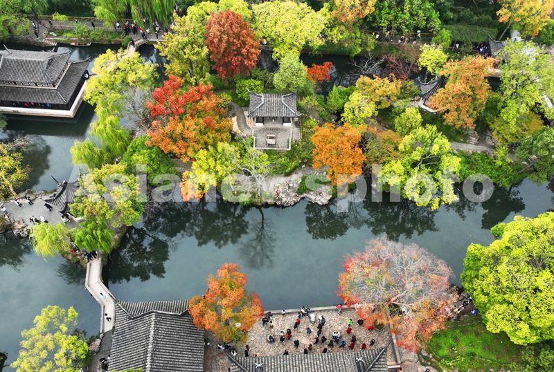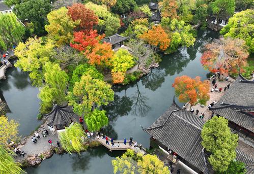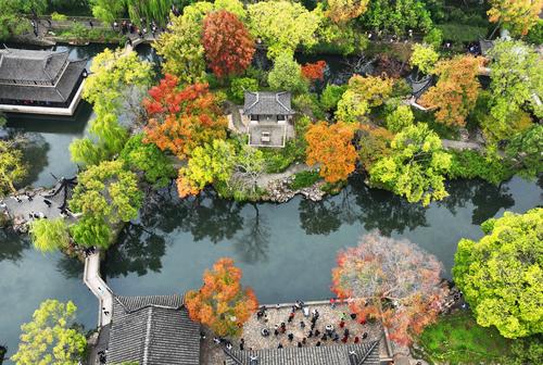 2023年11月12日,秋去冬来的苏州古典园林拙政园色彩斑斓如画景致(无人机照片)。