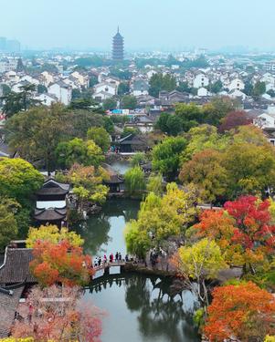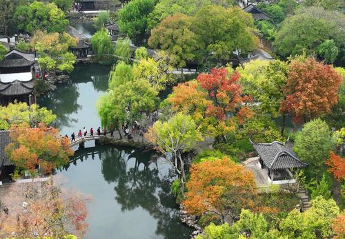 2023年11月12日,连日受冷空气影响的江苏苏州降雨降温,寒气袭人,当天早晨最低气温首次跌至立秋以来“个位数”的9.3摄氏度。苏州古典园林拙政园内一株株银杏、枫叶、乌桕等古树名木姹紫嫣红,像被打翻了的调色盘,与清澈的园林池塘、亭台楼阁等古典建筑交相辉映,渲染成一幅色彩斑斓的迷人画卷,吸引许多周末市民及外地游客游园赏景。