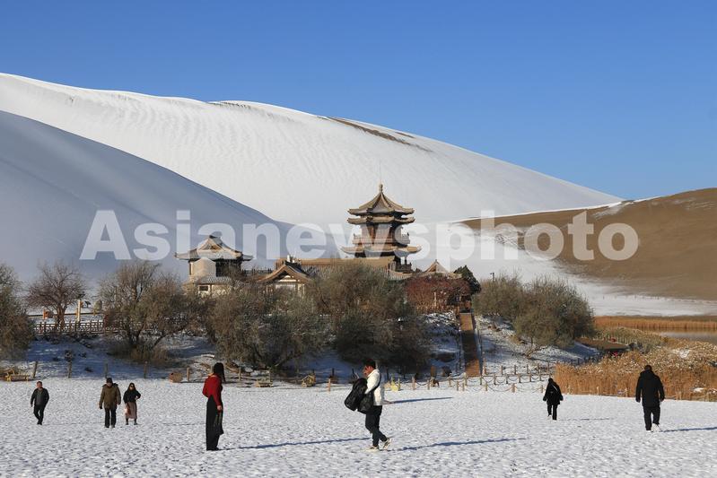 图片说明:2023年11月15日,游客在甘肃省敦煌市鸣沙山月牙泉景区欣赏雪景。