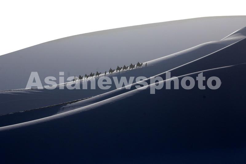图片说明:2023年11月15日,游客在甘肃省敦煌市鸣沙山月牙泉景区欣赏雪景。