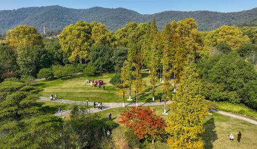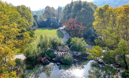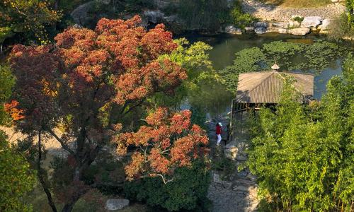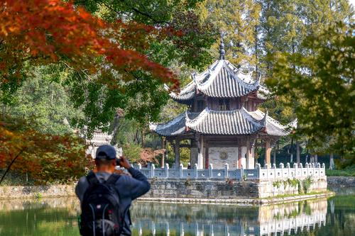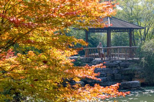 2023年11月14日,深秋时节,湖北省襄阳市习家池景区枫叶火红、法国梧桐金黄,处处秋景如画,吸引了许多市民和游客前往赏秋。