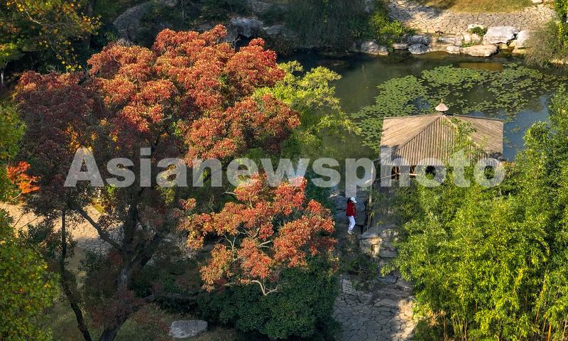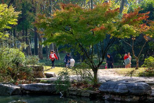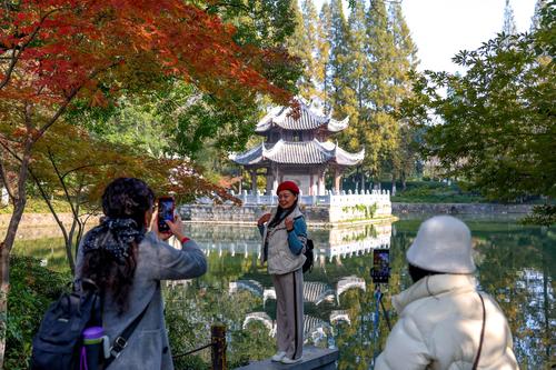 2023年11月14日,湖北省襄阳市习家池景区秋景如画,吸引了许多市民和游客前往赏秋。