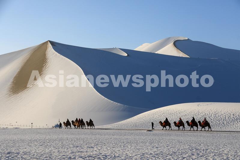 图片说明:2023年11月15日,游客在甘肃省敦煌市鸣沙山月牙泉景区欣赏雪景。