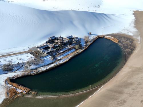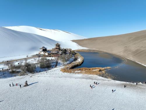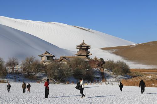 图片说明:2023年11月15日,游客在甘肃省敦煌市鸣沙山月牙泉景区欣赏雪景。