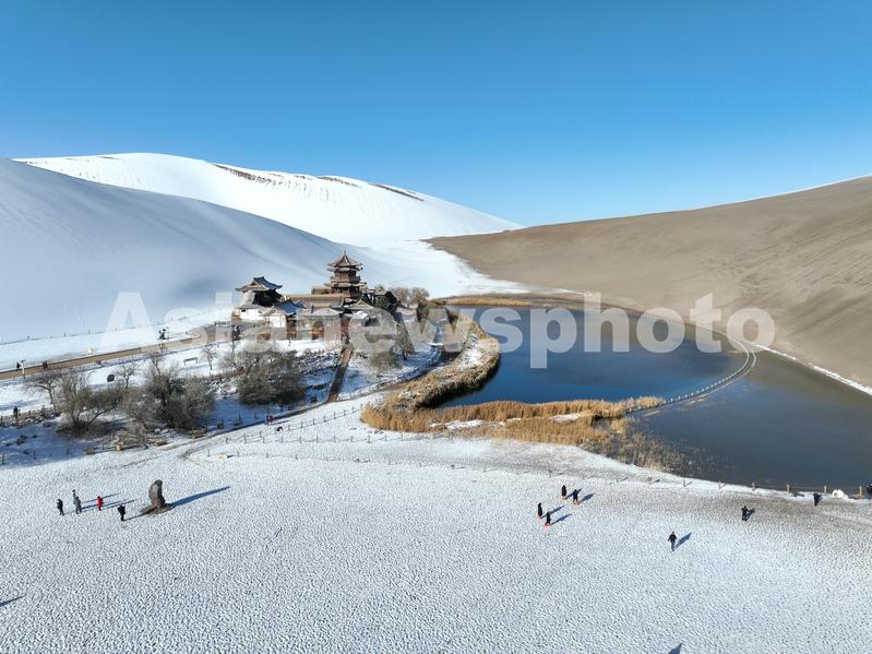 图片说明:2023年11月15日,游客在甘肃省敦煌市鸣沙山月牙泉景区欣赏雪景。