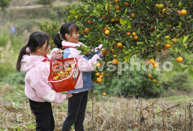 2023年11月14日,小学生在贵州省黔西市素朴镇素丰小学的校园农场里采摘橘子。