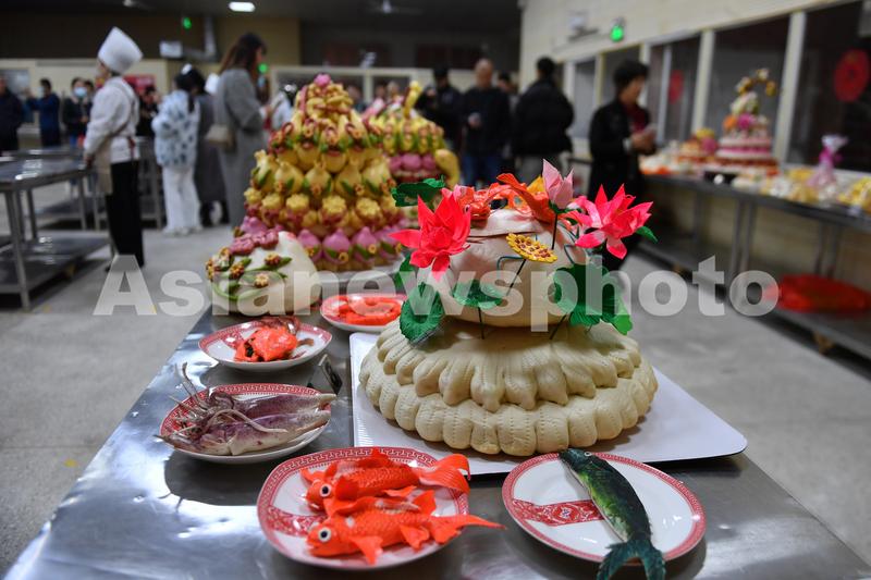 图片说明:2023年11月16日,在山东省青岛市崂山区王哥庄举行的馒头大赛上,展示的当地渔家特色的海鲜生日面塑参赛作品。