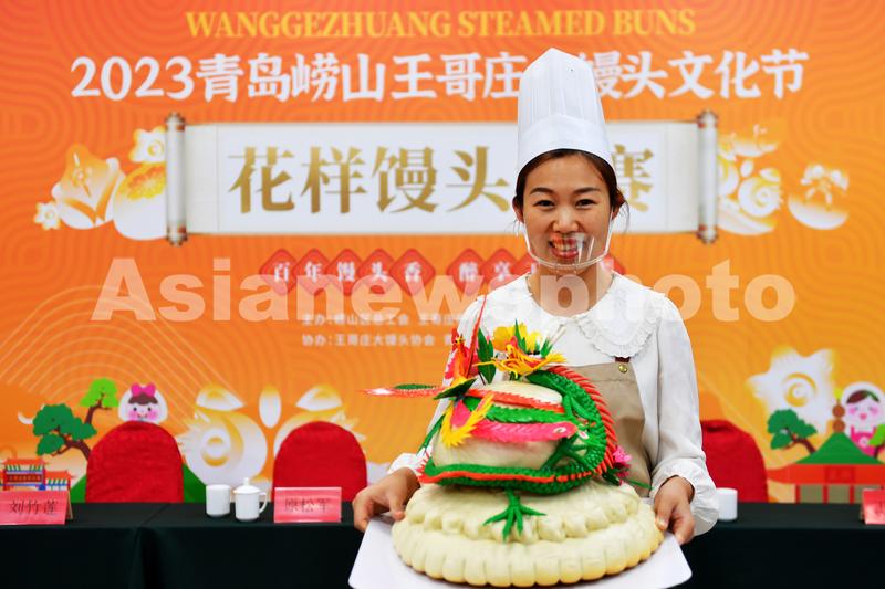 图片说明:2023年11月16日,在山东省青岛市崂山区王哥庄举行的馒头大赛上,村民展示咱家制作的“龙凤呈祥”面塑参赛作品。