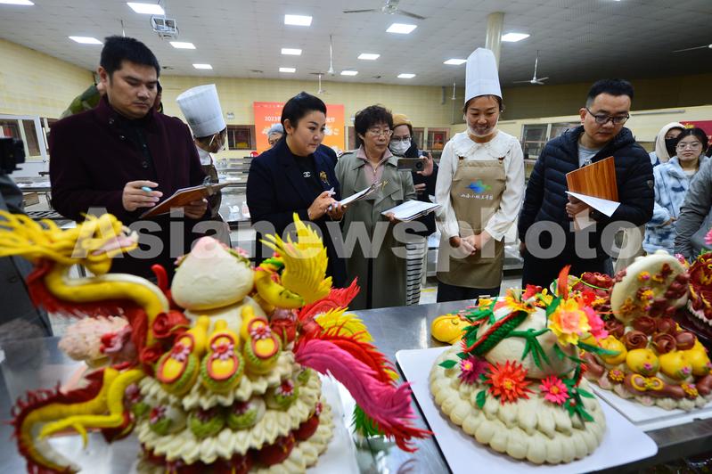 图片说明:2023年11月16日,在山东省青岛市崂山区王哥庄举行的馒头大赛上,评委对各家参赛的面塑进行评比打分。