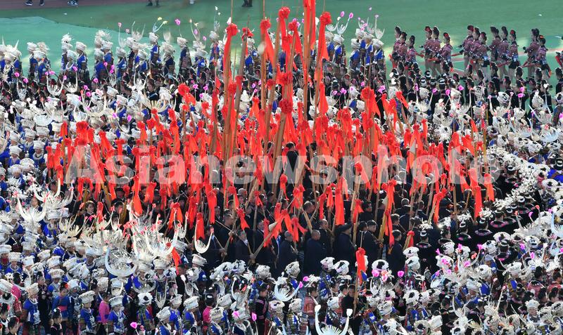 2023年11月16日,穿着盛装的苗族群众在2023中国·雷山苗年暨鼓藏节开幕式上跳起盛大芦笙舞。