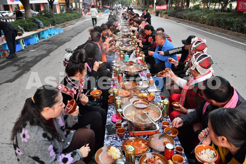 2023年11月16日,游客在2023中国·雷山苗年暨鼓藏节开幕式后享用长桌宴。