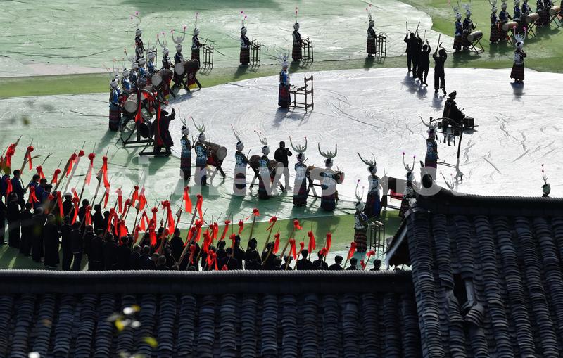 2023年11月16日,穿着盛装的苗族群众在2023中国·雷山苗年暨鼓藏节开幕式上展示非遗。