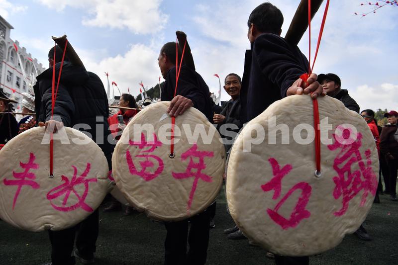 2023年11月16日,苗族群众挑着大糍粑参加2023中国·雷山苗年暨鼓藏节非遗大巡游。