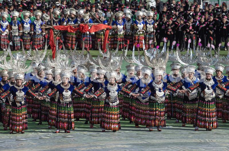 2023年11月16日,身着盛装的苗族群众在参加开幕式歌舞表演。