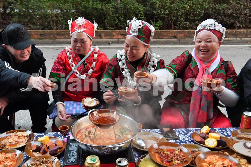 2023年11月16日,苗族妇女在2023中国·雷山苗年暨鼓藏节开幕式后的长桌宴与游客相互敬米酒。