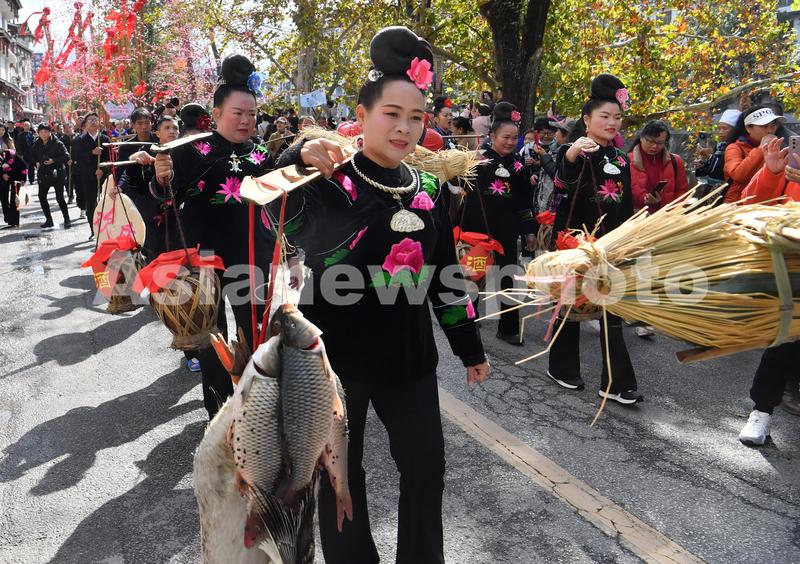 2023年11月16日,苗族妇女挑着鱼和酒参加2023中国·雷山苗年暨鼓藏节非遗大巡游。