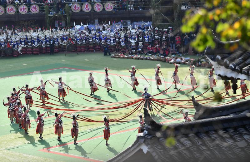 2023年11月16日,穿着盛装的苗族女青年在2023中国·雷山苗年暨鼓藏节开幕式上表演锦鸡舞。
