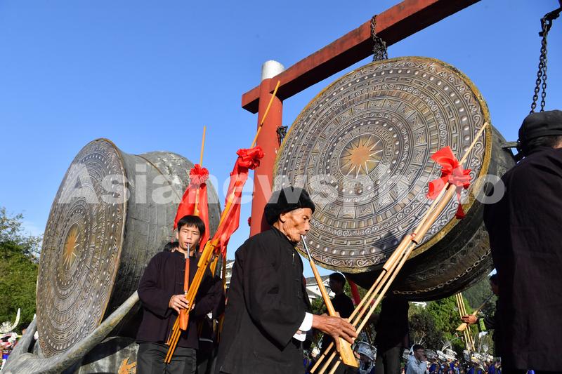 2023年11月16日,苗族群众在2023中国·雷山苗年暨鼓藏节开幕式上围着铜鼓吹奏芦笙。