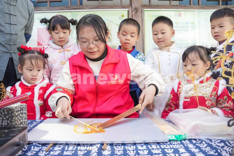 图片说明:2023年11月17日,浙江省湖州市长兴县夹浦中心幼儿园的小朋友们在观看非物质文化遗产糖画的制作过程。