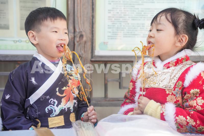 图片说明:2023年11月17日,浙江省湖州市长兴县夹浦中心幼儿园的小朋友们在品尝制作好的糖画。
