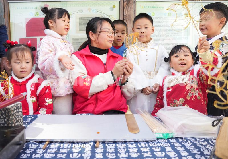 图片说明:2023年11月17日,浙江省湖州市长兴县夹浦中心幼儿园的小朋友们在观看非物质文化遗产糖画的制作过程。