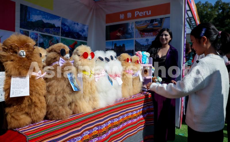 图片说明:2023年11月18日,湖北武汉,小朋友被智利展台上的玩偶吸引。