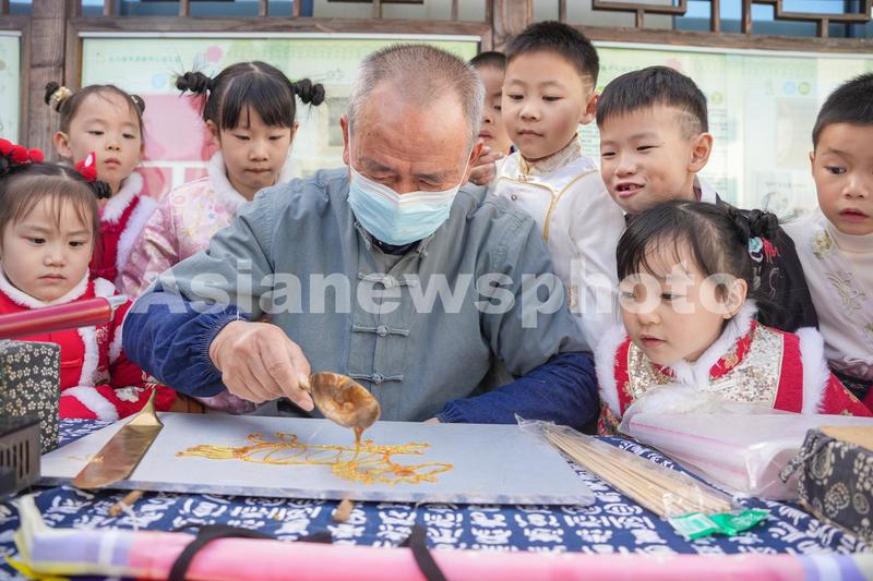 图片说明:2023年11月17日,浙江省湖州市长兴县夹浦中心幼儿园的小朋友们在观看非物质文化遗产糖画的制作过程。