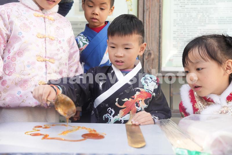 图片说明:2023年11月17日,浙江省湖州市长兴县夹浦中心幼儿园的小朋友们在体验制作非物质文化遗产糖画。