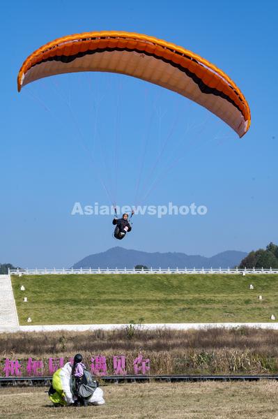 图片说明:2023年11月20日,浙江省兰溪市女埠街道白露山滑翔伞训练基地,来自全国各地的滑翔伞运动员在空中滑翔,进行滑翔伞定点赛。